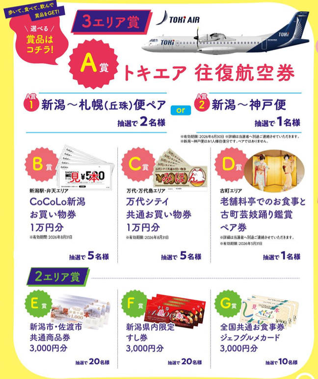 豪華目玉賞品のトキエアの新潟から札幌や神戸への往復航空券に応募できます!